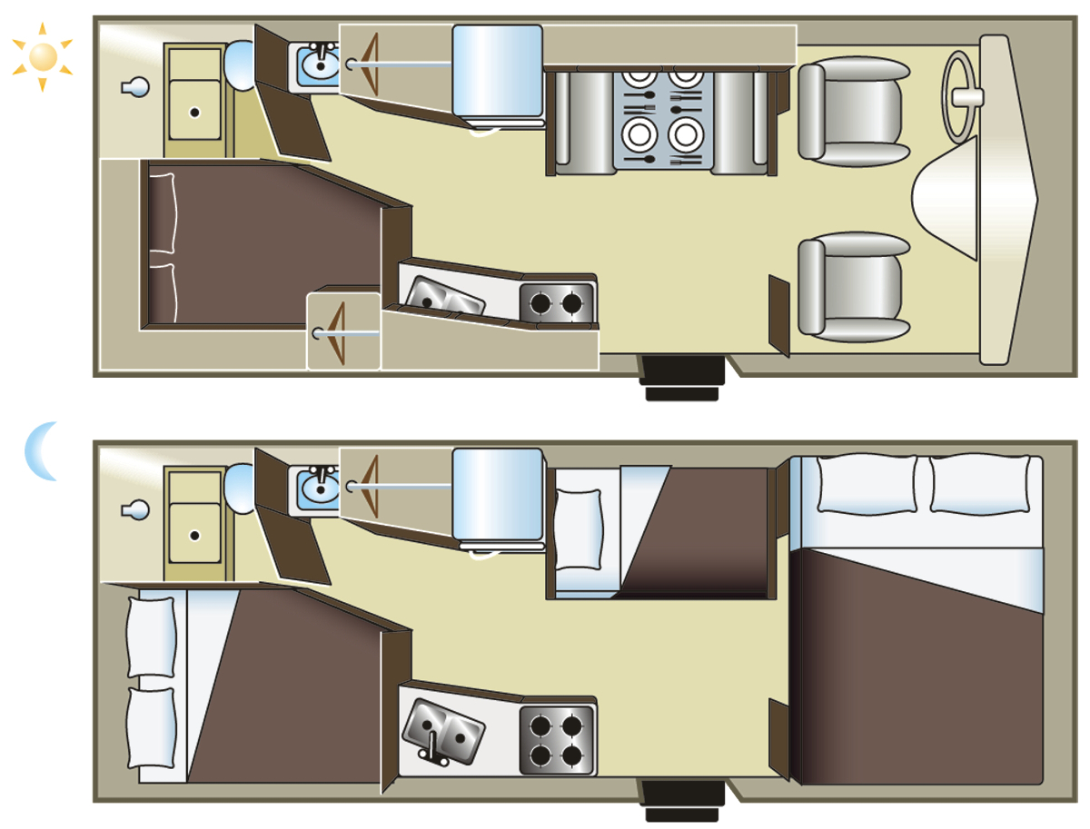 | Overcab Bed 135cm x 213cm / 53" x 84" Rear Bed 127cm x 203cm / 50" x 80" |